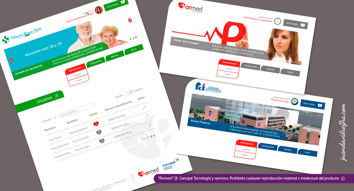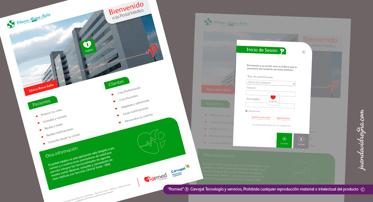 (See construction) Carvajal T&S Project. Pormed is a tool focused on patients and health professional, for the purpose of agenda appointments and other clinic process of the health area. My role as designer in this project among a team of engineers, it involved the re design of the visual identity, starting off by improving the image of a product that already exists, and from there, create design pieces for its application on Web. This is a preview of the samples from this project, which right now is on production process.